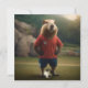 "Soccer Capybara: Ready to Play", a spirited capybara is all set for the game, dressed in a bright soccer outfit complete with a team jersey and shorts. A soccer ball at its feet. The capybara stands poised on the field, surrounded by green grass and the excitement of the match. The sun casts a warm glow over the scene, highlighting the capybara's athletic stance and determination. A true soccer star in the making, ready to score!