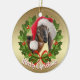 Beautiful Nubian Goat Doe Kid Custom painting by goatlady of GetYerGoat™ All decked out in her Santa Hat, Surrounded by a green Christmas wreath of Holly on a gold background on one side and Silver Bokeh background on the other side - Customize the Greeting that Says Merry Christmas on one side , customize the herd name, farm name or goat's name (OR ANY WORDING) as well as the year on the opposite side - Goat Christmas ornament for your Holiday gift giving, Christmas tree or window ornaments- double sided designs and can be personalized. Perfect for ornament swaps at Christmas Parties , Breeder gifts, veterinarian gifts, Show gifts.