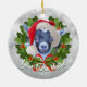 Adorable Pygmy Goat Kid Custom painting by goatlady of GetYerGoat™ All decked out in her Santa Hat, Surrounded by a green Christmas wreath of Holly on a gold background on one side and Silver Bokeh background on the other side - Customize the Greeting that Says Merry Christmas on one side , customize the herd name, farm name or goat's name (OR ANY WORDING) as well as the year on the opposite side - Goat Christmas ornament for your Holiday gift giving, Christmas tree or window ornaments- double sided designs and can be personalized. Perfect for ornament swaps at Christmas Parties , Breeder gifts, veterinarian gifts, Show gifts.