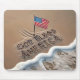 A United States flag is proudly planted in the sand, where the words "GOD BLESS AMERICA" are prominently carved out, just at the edge of a foam-covered shoreline