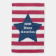 Red and white horizontal pin stripes with a big blue star and the white lettering phrase inside.