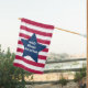 Red and white horizontal pin stripes with a big blue star and the white lettering phrase inside.