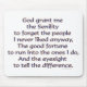 God grant me the Senility to forget the people I never liked anyway, The good fortune to run into the ones I do, And the eyesight to tell the difference. - Parody of the Serenity Prayer. Funny and humorous saying.
