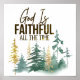 Inspirational quote poster depicts a simple nature watercolor design with a forest of green and gold pine trees. It features an encouraging Christian quote, "God is Faithful All the Time."