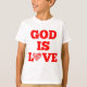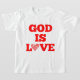 This boys t-shirt features a chunk five print font with red letters displaying the biblical saying "God Is Love" with the O in Love made replaced with a collection of the word Love made into a heart in this biblical saying quote theme. This tee is comfortable, casual and loose fitting, made from 100% cotton, with double-needle stitched bottom and sleeve hems for extra durability our tees fit and wears well on any and everyone.