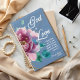 Personalized Christian Planner with Bible Verse. Designed with verse “God is Love” from 1 John set against a deep blue background with elegant delicate pink watercolor flower.