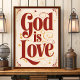 A vintage Christian typography piece with the phrase 'God is Love' in a bold yet elegant serif font. The font is decorated with delicate script accents. The background has a soft, weathered texture resembling aged paper or canvas. There are small, ornate flourishes like hearts, vines, and subtle crosses around the text. The piece uses warm hues of red, gold, and cream to give it a classic, timeless appeal.