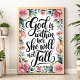 An elegant, bold calligraphy style text that says "God is within her she will not fall". The text is placed on a feminine pastel watercolor floral frame.