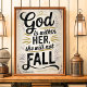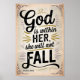 A vintage Christian typography wall art with the phrase "God is within her, she will not fall". It uses a mix of distressed script and bold serif fonts. The background is a light, faded color resembling old book pages. There are subtle, hand-drawn decorative elements like crosses and vines. The color palette is soft, with shades of peach, lavender, and gold.
