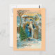 Delightful Swedish Christmas card showing Santa Claus arriving at a garden gate with a big sack of gifts and toys.