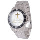 Elegant men's watch with gold text and cross on a white background with "God Loves You!".