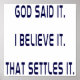 Plain and simple letters tell it like it is: "God said it. I believe it. That settles it." Great way to share your faith in God and belief in your religion. Great gift for religious occasions such as baptisms, confirmations, first communions, weddings, ordinations and more. Also good at Christmas, Easter and birthdays, too.