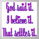 Purple letters read, "God said it. I beleive it. That settles it." Hearts dot the i's. Fun way to show your love of your religion and your faith in God. Great gift for weddings, ordinations, baptisms, first communions, confirmations, and any holy day. Wonderful for Christmas, Easter and birthdays too.