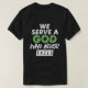 This black t shirt features a bold, white and green text graphic that reads "WE SERVE A GOD WHO NEVER FAILS". The word "GOD" is highlighted in green.