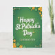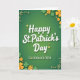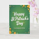This design shows a rich green background that fades from bright emerald to deep forest tones, setting a festive St. Patrick’s Day scene ☘️. Centered near the top, “Happy St. Patrick’s Day” appears in crisp white lettering with a gentle shadow that helps it stand out. Shamrocks and four-leaf clovers gather in the corners like a leafy frame, layered in several green shades with touches of warm golden-orange. Small golden blossoms are sprinkled between the leaves, adding little points of light that feel like shared glances in a friendly, cozy celebration 💚. Beneath the main greeting, “GODDAUGHTER” sits in uppercase sans-serif letters, spaced neatly and aligned under the white headline. In the word “GODDAUGHTER,” the ampersand is replaced by a tiny golden dog silhouette, a sweet detail that suggests a close bond. The corners remain filled with clover clusters and golden accents, surrounding the centered white text on the green gradient.