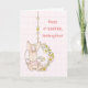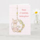 Your goddaughter is very special and on her first Easter, this will be an adorable card to send her! A bunny is sweetly sitting on a vine wreath with a soft pink pattern background.