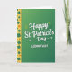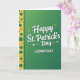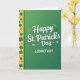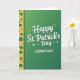 This card features a rich emerald-green background with a soft gradient that sets a cozy St. Patrick’s Day scene 💚. Centered across the front, the message reads “Happy St. Patrick’s Day GODMOTHER!” in white lettering, standing out clearly against the green with a gentle shadow for depth. The word “Happy” sits above the rest of the line, with tiny yellow spark marks around it that feel like a little burst of excitement shared between close family. Along the left edge, a tall vertical border stacks stylized shamrocks in deep green, sunny yellow, and warm orange, sprinkled with small yellow dots for extra texture ☘️. A small shamrock icon appears near “Patrick’s,” tying the greeting to the holiday without crowding the text. White arrow shapes flank the word “Day,” pointing inward as if drawing the eye back to the name “GODMOTHER!” at the end. The clovers in the border look slightly raised, with shaded edges that give them a layered, embossed look against the flat green field.
