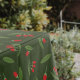 A tablecloth with an illustration of goji berries on a dark green background: a lovely gift for a person who has just moved or for your home decoration!