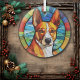 Here's a pretty glass ornament with a stained glass theme, featuring a beautiful Basenji dog. The dog is bright gold and white, and set against a predominantly blue abstract background with a multi color border. This makes a nice stocking stuffer or decoration for the household who loves a Basenji.
