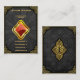 Gold ace of diamonds business card design, with gold floral ornamental frame and grungy vintage stripes in the background.