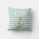 Gold glitter anchor aqua blue and white stripes nautical summer throw pillow. The focus of this trendy turquoise nautical design is the gold anchor and your name in navy blue on a white frame with gold outline.