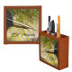 This wood and ceramic tile desk organizer beautifully depicts a gold and black feather quill fountain pen reflected against a gold and green background is an ideal gift for anyone for their home office or business work desk. A sophisticated artistic style with a touch of vintage luxury, this desk organizer will be welcome on any desk and elegantly hold your pens and such. Personalize with initials on one side and name or business, it is a unique gift to be treasured.