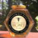 Gold Label with Vintage Queen Bee features a black border circling your Apiary Name and Location. Apiary name is displayed in curved text across the top and the beekeeper's name, city and town are written in curved text on the lower half of the label. There is a delicate gold border near the outer perimeter of the label. The word "Honey" is written in a decorative font in metallic gold text.