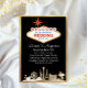 This wedding invitation features a classic Las Vegas theme on a black background. A skyline image of the Vegas strip is printed across the bottom portion in gold pattern. A matching gold frame borders the invitation. The classic retro "welcome to Las Vegas" sign is printed at the top. You can personalize the sign to include your own custom wedding information or other text.