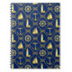 A gold rope grid frames a variety of gold nautical objects- sailboat, lighthouse, ship's wheel and anchor. The background is dark blue. This notebook makes a great diary, travel journal, writing pad, school notebook, or planner.