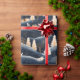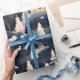 This wrapping paper features a serene winter landscape—dusty blue snow blanketing the earth, glowing white pine trees stretching towards a twilight sky, charming gold houses twinkling with the promise of warmth, and a lone white dog meandering through the scene as if on a magical journey.
