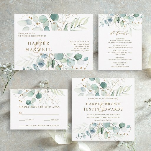 This return address label features painted watercolor eucalyptus, botanical green and gold glitter leaves with gold script.