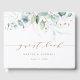 This wedding guest book features painted watercolor eucalyptus, botanical green and gold glitter leaves with gold script.