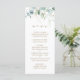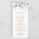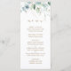 This wedding menu features painted watercolor eucalyptus, botanical green and gold glitter leaves with gold script.