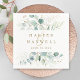 This wedding napkin features painted watercolor eucalyptus, botanical green and gold glitter leaves with gold script.