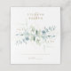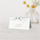 This wedding place card features painted watercolor eucalyptus, botanical green and gold glitter leaves with the couple's name on the back.