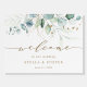 This wedding welcome sign features painted watercolor eucalyptus, botanical green and gold glitter leaves with gold script.