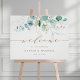 This wedding welcome sign features painted watercolor eucalyptus, botanical green and gold glitter leaves with gold script.