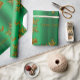 This Christmas wrapping paper features a green and gold design, with a pattern of striking metallic gold Christmas decorations over a green gradient background. There are large gold snowflakes, golden holly leaves, a little gold Santa and his sleigh being pulled by reindeer, and a very festive greeting of 'Merry Christmas'.