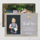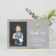 Simple, elegant Gold and Navy Blue christening and baptism thank you cards. Send thanks to family and friends with this modern personalized thank you religious flat card. It features hand lettered ”Thank You” script, around double faux gold foil frame and gold glitter confetti on grey background. This modern beautiful photo thank you card will also be perfect for baptism / christening / naming ceremony / confirmation and holy communion thank you card for boy or girl. #3354