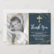 Simple, elegant navy blue christening and baptism thank you cards. Send thanks to family and friends with this modern personalized thank you religious flat card. It features hand lettered ”Thank You” script, around double faux gold foil polygonal frame on navy background. This modern beautiful photo thank you card will also be perfect for baptism / christening / naming ceremony / confirmation and holy communion thank you card for boy or girl. #3354