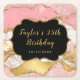 This elegant and glamorous birthday coaster features a pink and white agate marble background with faux gold glitter accents. The text combines handwritten script and modern sans serif fonts for a classy and sophisticated look. The sequins and distressed texture creates the perfect blend of chic and grunge.