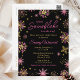 This elegant and glamorous invitation postcard features watercolor gold and pink faux glitter snowflakes and sparkles on a black background. It is perfect for a winter or Christmas themed baby shower.