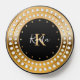 Glam design featuring gold and white diamond circle, custom monogram on black.