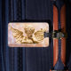A pretty angel on a sparkling lights background in pastel pink with gold colors. And let's face it: who wouldn't want an angel as travel companion?