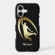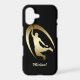 This phone case designed for the basketball player or fan features a gold silhouette basketball player dunking the ball, with a gradient gold swoosh design behind him. A text field allows you to personalize it. The image and text are placed on a black background. *Clip art used in this design is copyrighted by Encore Software, Inc., which permits use to its licensors. All rights reserved.