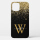 Modern iPhone 12 case in black and gold glitter, elegantly adorned with your script monogram, first name and initial.