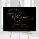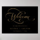 This gold and black wedding welcome sign (poster) featuring elegant and romantic swirly calligraphy lettering with a formal script. For more advanced customization of this design, please click the BLUE DESIGN TOOL BUTTON above!