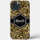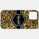 Chic gold and black leopard print iphone 13 pro max case with a custom name and monogram template. A cute and trendy safari animal print pattern background topped with your own bit of personalization.