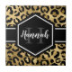 Chic gold and black leopard print small ceramic tile with a custom name and monogram template. A cute and trendy safari animal print pattern background topped with your own bit of personalization.