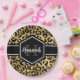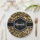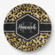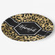 Chic gold and black leopard print paper plate with a custom name and monogram template. A cute and trendy safari animal print pattern background topped with your own bit of personalization.